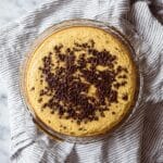 A round, freshly baked cake sits in a clear glass dish with two handles, placed on a white marbled surface covered by a soft, folded gray cloth with white stripes. The cake has one thick layer with a golden brown color and a slightly uneven textured top. Scattered on the cake are unevenly spread dark chocolate pieces and crumbs, some melted and some solid, adding a speckled contrast to the smooth golden surface. The cake rises slightly in the center, showing a soft, fluffy texture. Photo taken with an iphone --ar 4:5 --v 7