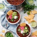 6. Serve: Spoon the chili into bowls and offer lime wedges and optional toppings such as sour cream, avocado slices, sliced serranos or jalapeños, cilantro, pickled onions, and tortilla chips to customize each serving.