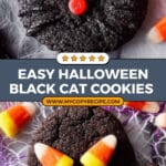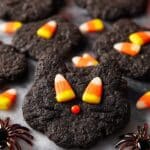 Delightfully rich and chocolatey Black Cat Cookies, perfect for Halloween celebrations. These sugar cookies combine dark cocoa and espresso for a deep chocolate flavor and are decorated with candy corn eyes and red sprinkle noses to create adorable black cat faces. Crispy on the edges with a soft center, these festive treats are sure to impress and satisfy.
