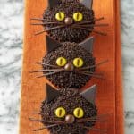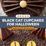 These Black Cat Cupcakes are a fun and festive chocolate treat perfect for Halloween or any themed party. The cupcakes boast rich chocolate flavor from moist chocolate bases to creamy chocolate cream cheese frosting, adorned with cute black cat faces crafted from gumdrops, licorice, and chocolate candy melts. Easy to decorate and sure to delight kids and adults alike!