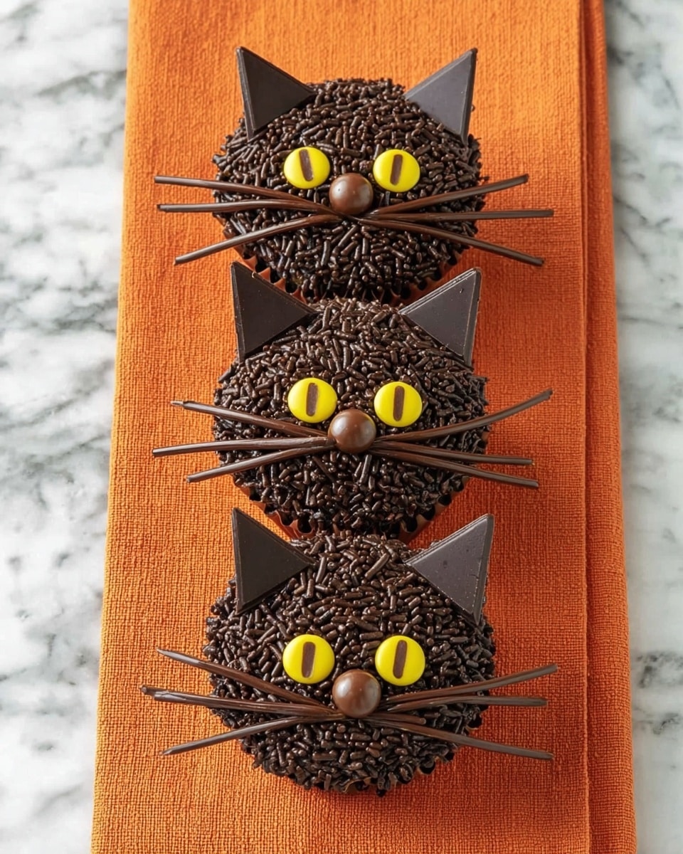 - Frost and decorate cupcakes: Spread the chocolate cream cheese frosting generously over each cupcake, then coat the sides and tops with chocolate sprinkles. Insert the chocolate triangle ears into the frosting on each cupcake, add the licorice whiskers, attach the gumdrop eyes, and pipe a small frosting nose using the prepared piping bag.