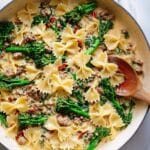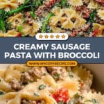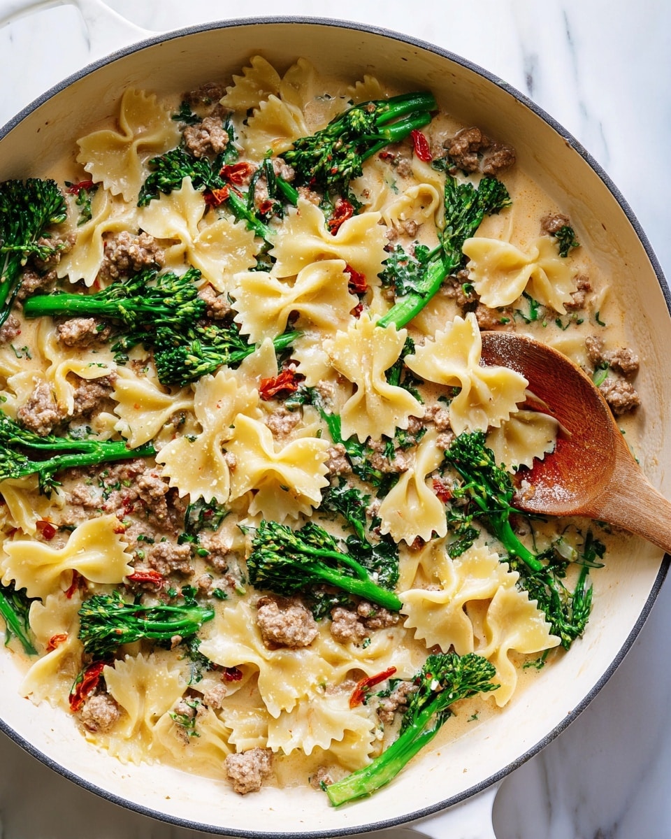 This Bow-Tie Pasta with Sausage and Broccoli is a quick and delicious one-pan pasta dish combining savory Italian sausage, tender broccolini, sun-dried tomatoes, and a light creamy sauce. Perfect for a comforting weeknight dinner, this recipe yields tender pasta simmered in a flavorful broth-based sauce enriched with heavy cream and Parmesan cheese, ready in just 30 minutes.