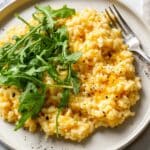 Once the rice is tender but still has a slight bite in the center, and all your broth is absorbed, remove the pan from heat. Stir in the freshly grated Parmigiano-Reggiano cheese until melted and combined. I like to taste here and adjust salt and pepper if needed. Serve immediately topped with fresh baby arugula and extra cheese if you’re feeling generous. This risotto is best enjoyed right away, while it’s still creamy and warm.