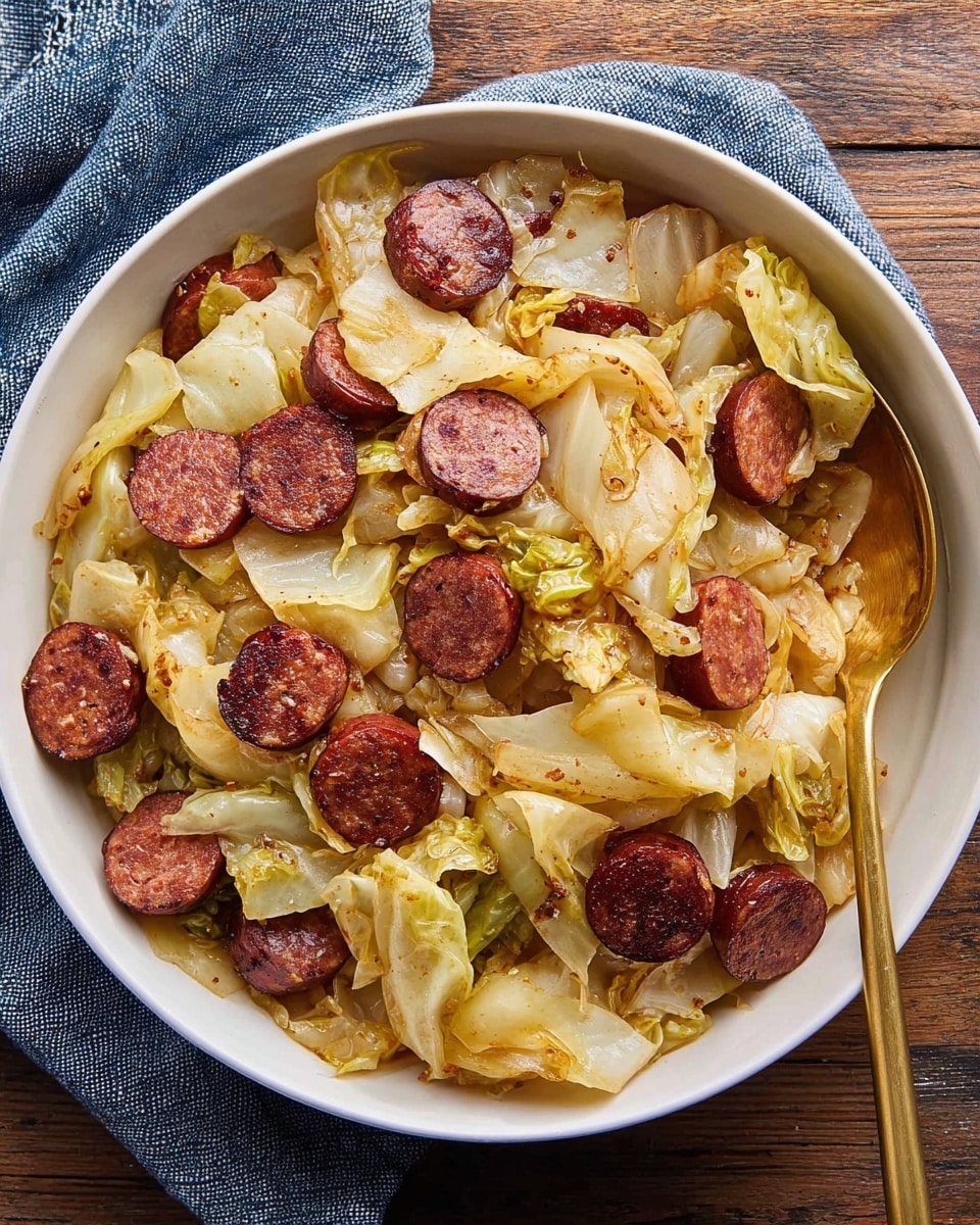 A hearty and flavorful one-skillet meal featuring smoky kielbasa sausage and tender cabbage, perfectly seasoned and cooked to a deliciously satisfying dish ideal for a quick weeknight dinner.
