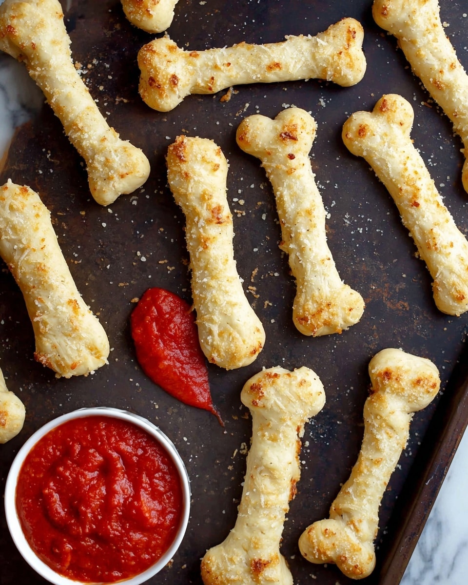 I love pairing these bone-shaped breadsticks with a big bowl of homemade or store-bought marinara sauce for dipping. They also go great alongside a fresh green salad or a bowl of chili for a full meal. At Halloween parties, I’ve served them next to finger foods like stuffed mushrooms and mini meatballs — everyone loved the cheesy contrast.