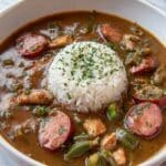 Chicken and Sausage Gumbo is a classic Cajun stew featuring tender chicken thighs, andouille sausage, and a rich dark roux base. This hearty and flavorful dish is simmered with fresh vegetables, Creole seasoning, and okra, creating a comforting meal perfect for any occasion. Served over white rice and garnished with parsley, green onions, and hot sauce, it’s a delicious taste of Louisiana cuisine.