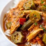 I love topping my gumbo with fresh chopped parsley and a wedge of lemon for a zesty brightness. A sprinkle of green onions adds a nice pop of color and mild onion flavor. And don’t forget some hot sauce on the side for those who like it with an extra kick!