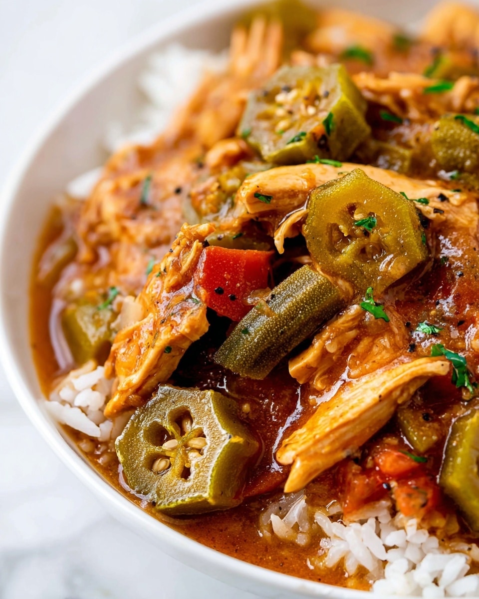 - Simmer the Chicken: Add the shredded cooked chicken into the gumbo. Continue simmering for an additional 15 minutes, allowing the chicken to absorb the rich flavors.