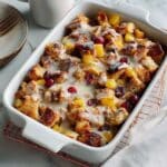 This Cranberry Apple Bread Pudding is a cozy, comforting dessert featuring tender challah bread soaked in a spiced custard, studded with caramelized apples and fresh cranberries, and topped with a smooth vanilla glaze. Perfect for the fall and winter seasons, it offers a delightful combination of sweet, tart, and warm cinnamon flavors in every bite.