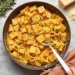 I recommend rigatoni or other ridged pasta shapes as they hold the creamy pumpkin sauce well, but penne, farfalle, or even fusilli are great substitutes. Just cook to al dente so the pasta has some bite and doesn’t get mushy.