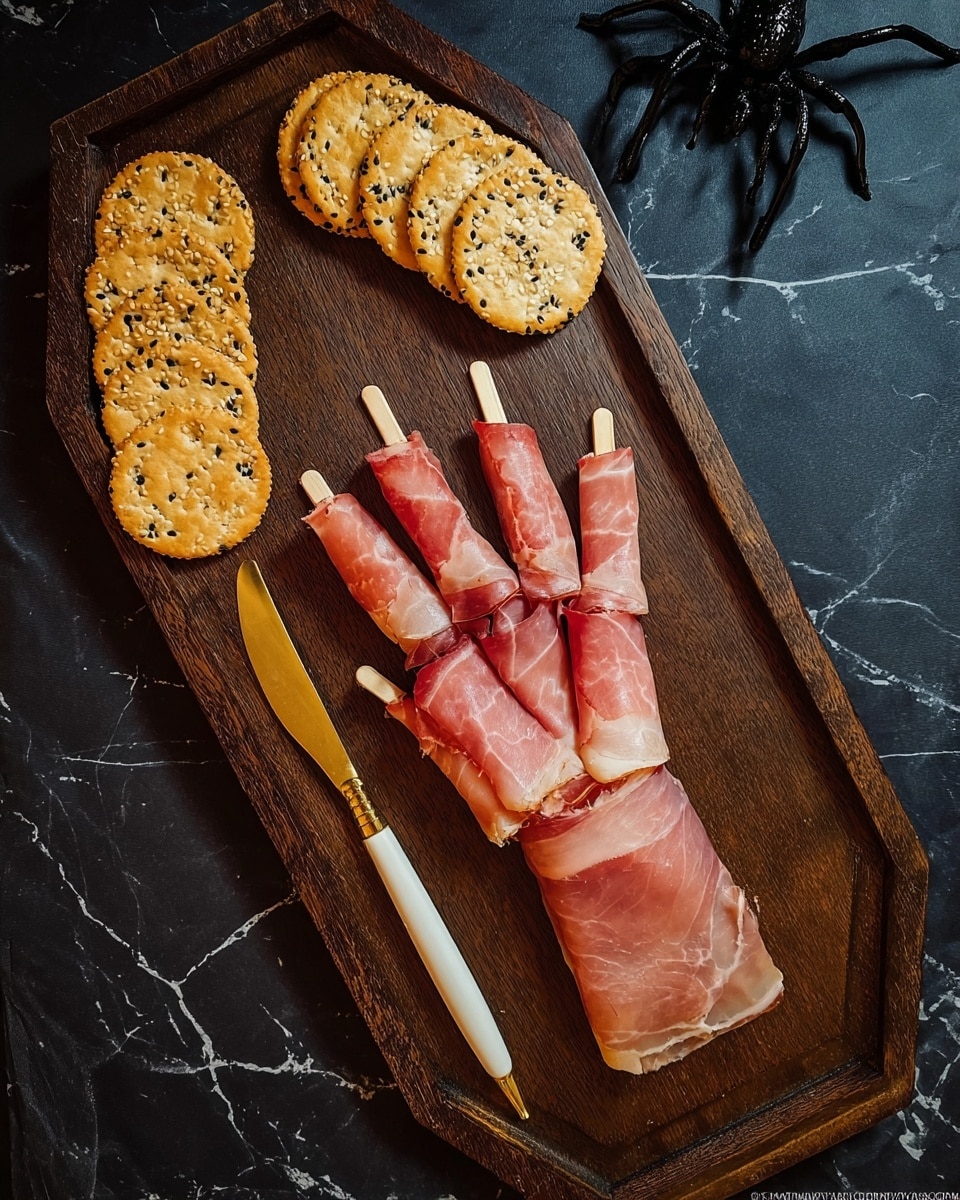 • Prosciutto slices: Thinly sliced prosciutto gives the hand that eerie, realistic skin-like texture—plus it’s salty and savory.