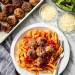 My family goes crazy for serving these meatballs with spaghetti tossed in marinara sauce, but you could also plate them over creamy polenta, garlic mashed potatoes, or alongside roasted veggies for a low-carb option. They pair well with pretty much anything you like!