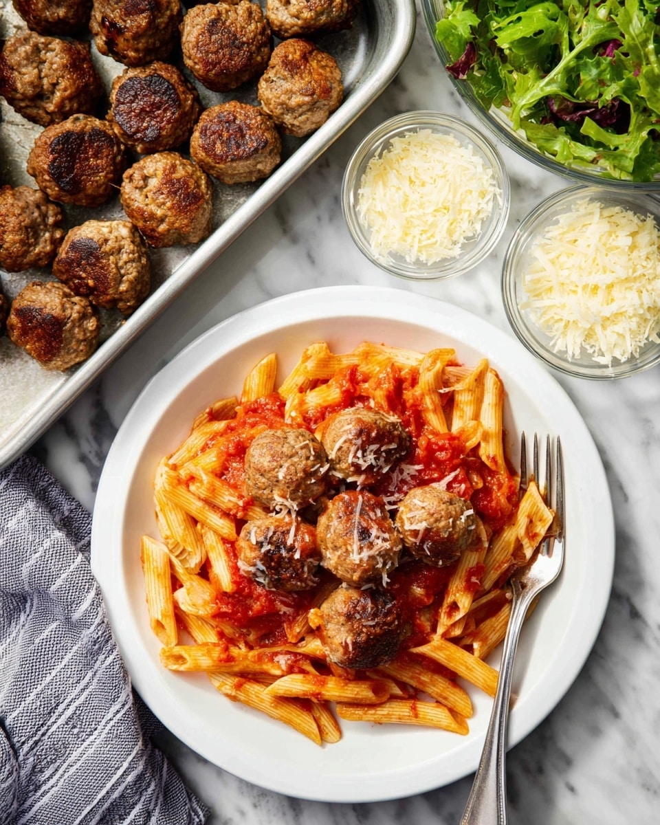 A white plate filled with layers of penne pasta coated in bright red tomato sauce topped with seven browned meatballs scattered on top. To the upper left, a silver tray holds many browned meatballs closely packed on a white marbled surface. To the upper right, there are two clear glass bowls, one filled with grated pale yellow cheese and the other with mixed green leafy salad. A silver fork rests on the bottom right edge of the plate. Photo taken with an iphone --ar 4:5 --v 7