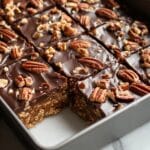 - Cool and Garnish: Allow the bars to cool completely before lifting them out of the pan using the parchment overhang. Optionally, garnish with extra chopped pecans, sea salt flakes, or drizzled caramel sauce before serving.