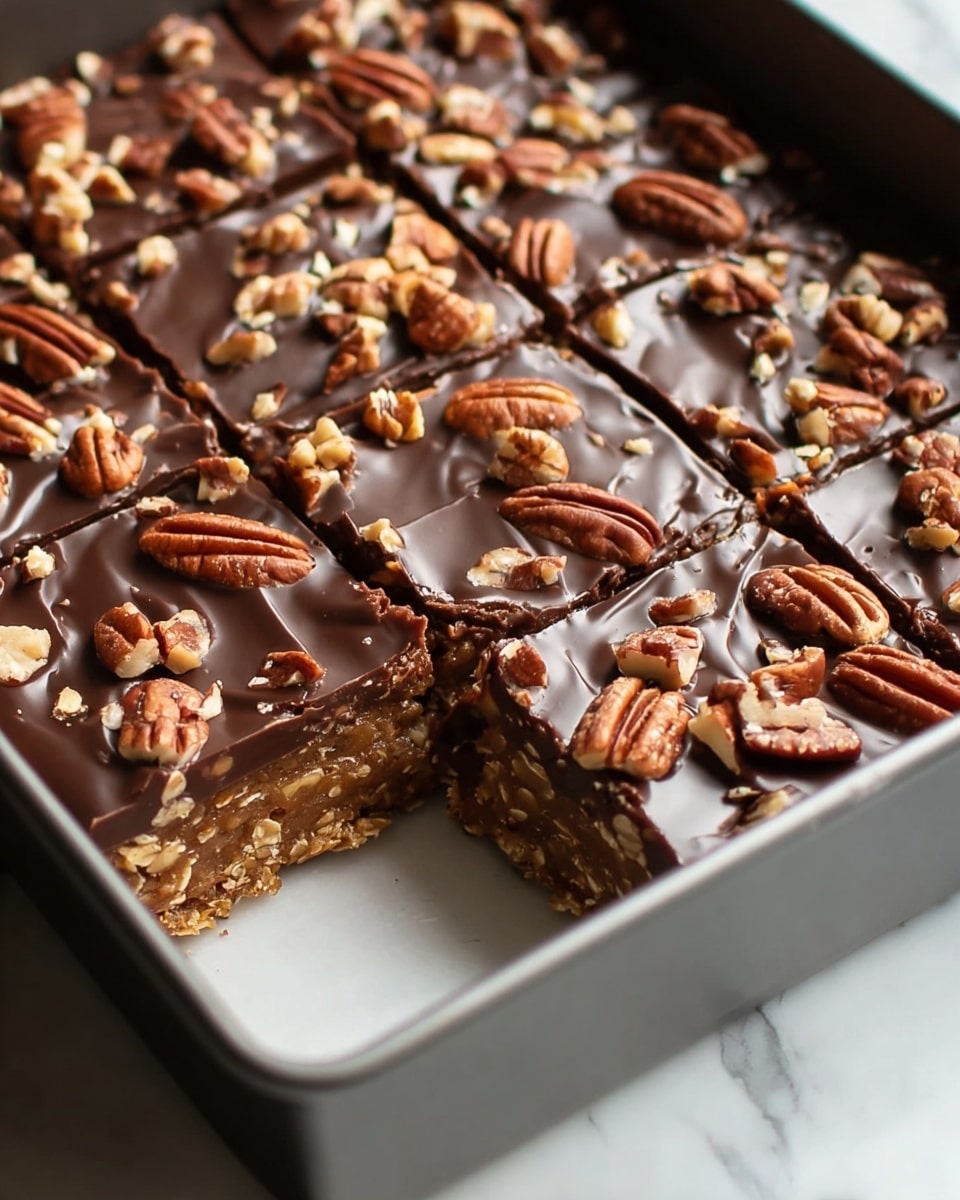 Once out of the oven, immediately sprinkle the milk chocolate chips evenly over the hot bars. Let them sit for a few minutes; the heat will gently melt the chocolate. Then, using an offset spatula or the back of a spoon, spread the melted chocolate into an even, glossy layer. If you’re feeling fancy, add extra chopped pecans, a sprinkle of sea salt, or a drizzle of caramel sauce right away.
