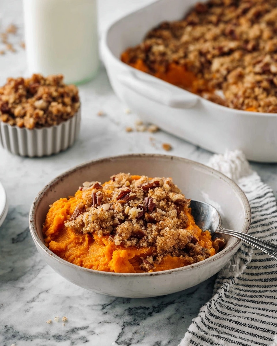 - Assemble the Casserole: Preheat your oven to 350°F (175°C). Spread the sweet potato mixture evenly in a buttered or greased 9×13 inch baking dish. Sprinkle the pecan topping evenly over the sweet potato layer.