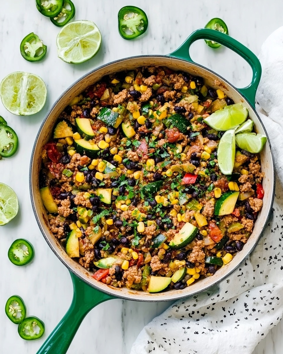 A quick and nutritious Ground Turkey Skillet loaded with zucchini, corn, black beans, and tomatoes, seasoned with cumin and garlic, perfect for a healthy weeknight dinner or meal prep.