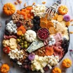 I always toss on candy eyeballs—they’re just so delightfully creepy and fun, especially when stuck onto mozzarella pearls. Fresh seasonal flowers add a delicate, unexpected beauty that guests admire. For a little extra flair, sprinkle a few more pomegranate arils and candy corn around the edges. It instantly elevates the festive feel and makes your board pop.