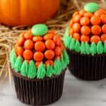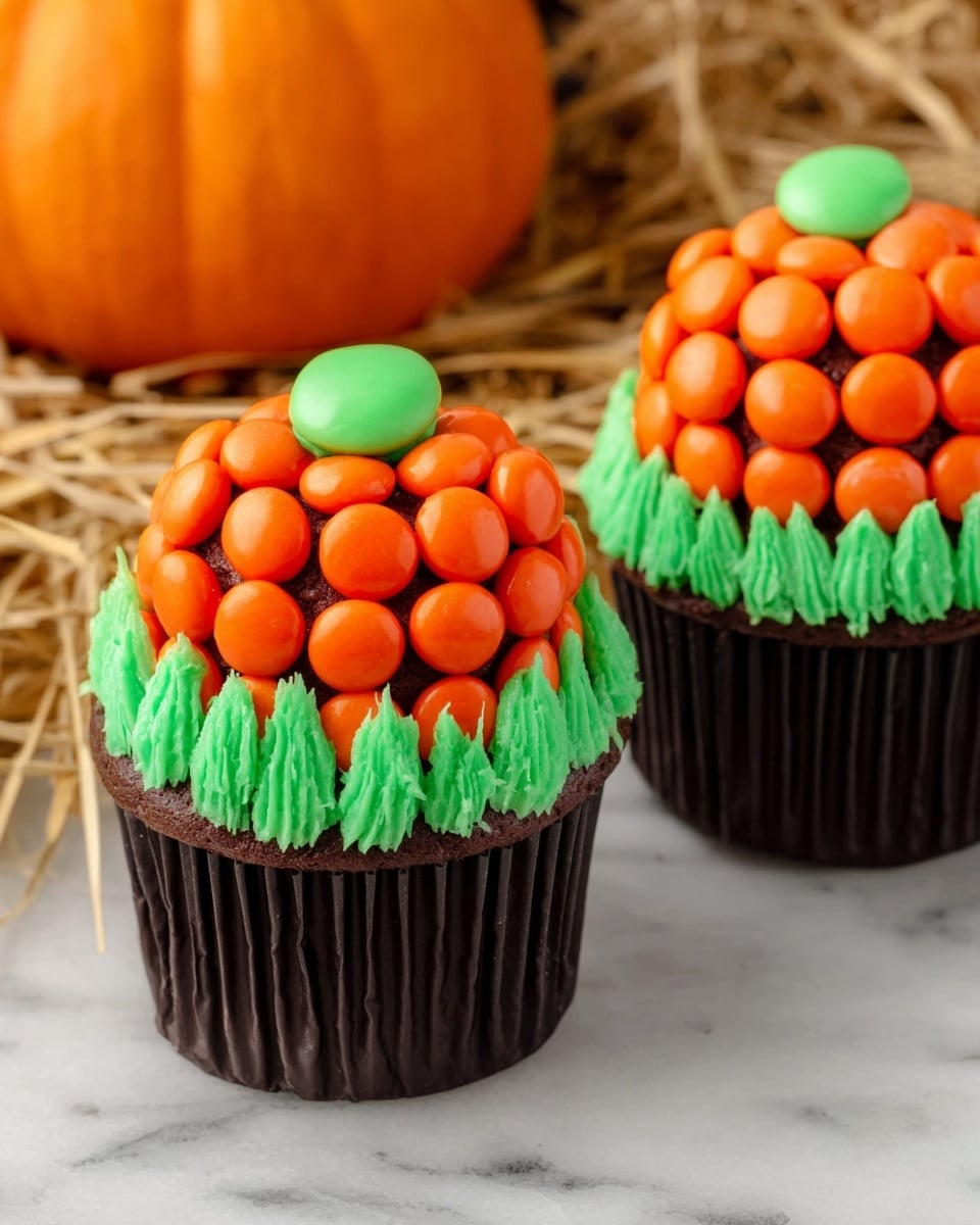 These Halloween Pumpkin Patch Cupcakes are a festive and adorable treat perfect for Halloween parties or school events. Featuring moist cupcakes topped with green buttercream frosting shaped like grass, a pumpkin body made from a marshmallow covered in orange frosting, and decorated with orange and green M&M’s to resemble a pumpkin patch, they are both fun and easy to make.