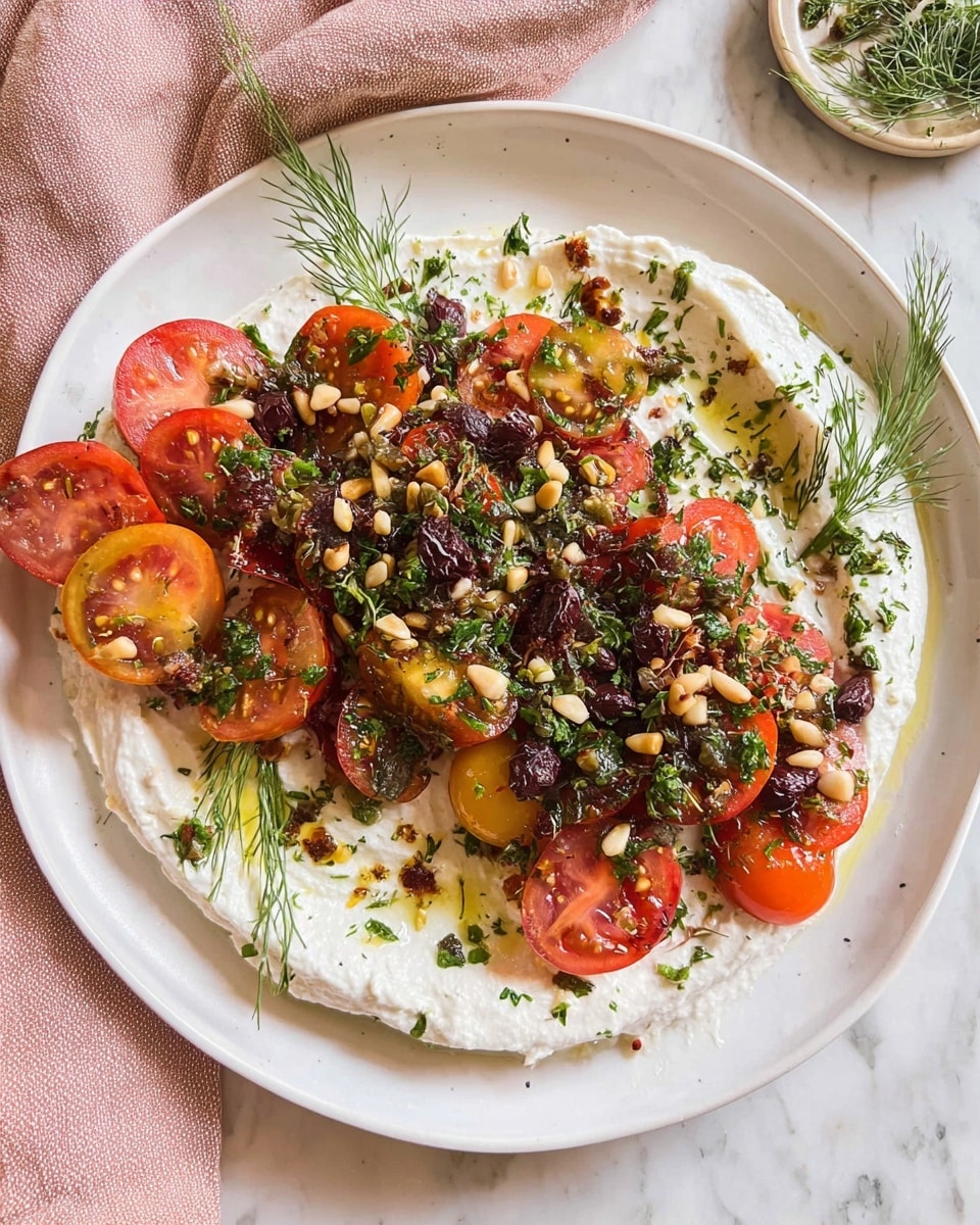 A refreshing summer salad featuring juicy heirloom tomatoes layered over creamy whipped ricotta, accented with tangy olives, capers, toasted pine nuts, and fresh herbs, all drizzled with high-quality olive oil for a vibrant, flavorful dish perfect for tomato season.