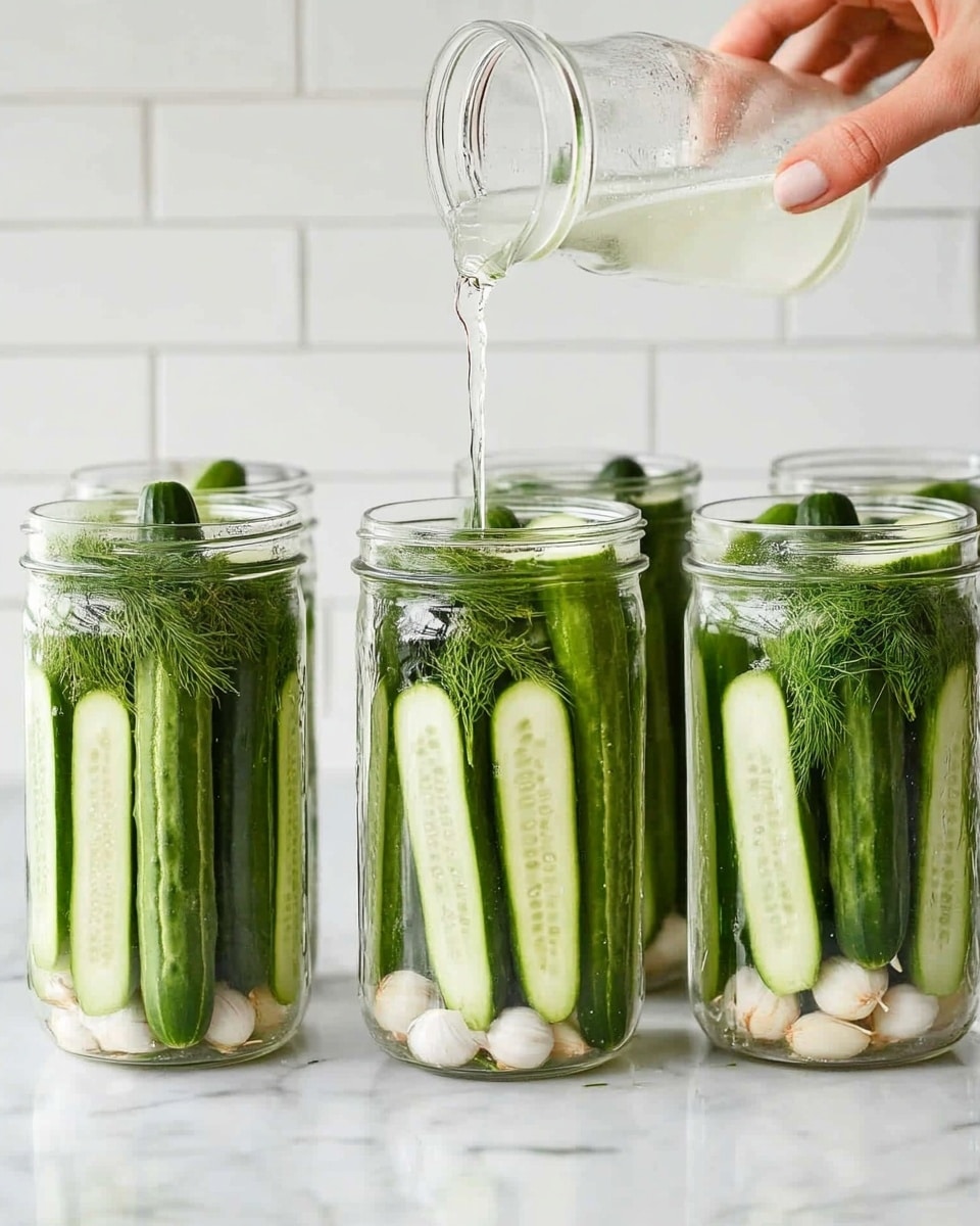 Pour the warm brine evenly over the cucumbers in your jars, fully covering them. Allow the jars to cool to room temperature before sealing with lids and placing them in the fridge. You’ll find the spears lightly pickled and ready in about 2 days, while chips get that tangy snap in a single day. The flavors deepen beautifully if you wait around 5-6 days for spears and even longer for chips.