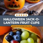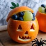 Jack-O-Lantern Orange Fruit Cups are a fun and healthy Halloween treat perfect for kids and adults alike. Hollowed out oranges are artfully carved with spooky faces and filled with fresh blueberries and quartered grapes, making a colorful and nutritious snack that’s easy to prepare and visually delightful.