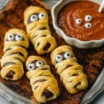 Pair these mummies with garlic bread or a crisp Caesar salad for an easy meal. My kids also enjoy carrot sticks and ranch when eating these as snacks. And of course, don’t forget plenty of marinara sauce for dipping—that’s the ultimate crowd-pleaser.