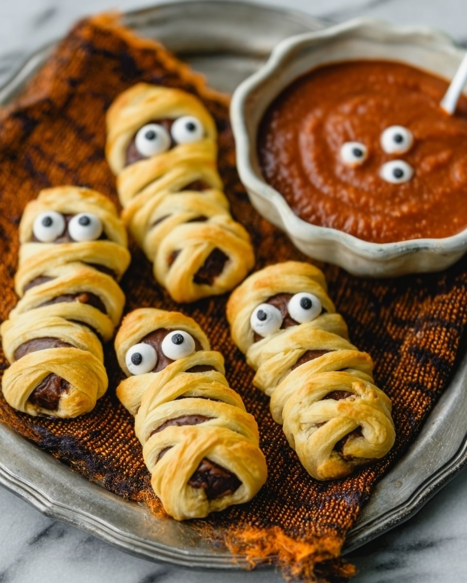Meatball Mummies are a fun and festive Halloween recipe featuring seasoned ground beef meatballs wrapped in crescent roll dough to look like mummies. Perfect as a spooky appetizer or main dish, these savory treats are baked until golden and served with marinara sauce for dipping. The combination of ground beef, Italian seasonings, and parmesan cheese creates a flavorful meatball mixture, while crescent roll strips add a delightful crispy crust to complete the mummy look.