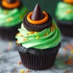 - Assemble the Cupcakes: Place an Oreo Thin on top of each cooled cupcake as the witch’s hat brim. Pipe or spread the green whipped topping over the cupcake to resemble melting witch’s hair or melted wax.