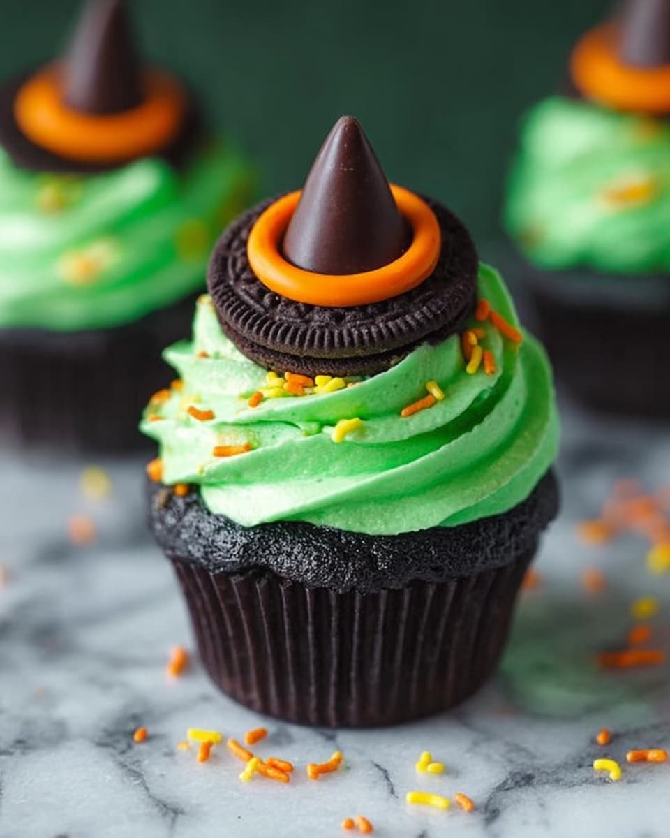 Pipe generous swirls of the tinted whipped cream onto each cooled cupcake. Place an Oreo Thin slightly pressed into the cream for the “hat brim.” Next, top each Oreo with a Hershey Kiss, and use black icing to create the classic witch hat details. For a little spooky fun, add grape gummies poking out for “witch fingers” and use pieces of black and white paper straws as broomsticks stuck into the side. This is the part where you get to channel your inner artist—and everyone will ooh and ahh.
