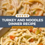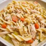 This old fashioned turkey and noodles recipe is a comforting, hearty dish perfect for using leftover turkey. Tender egg noodles are simmered in a flavorful broth with sautéed vegetables, creamy soup, and shredded turkey, making for a nostalgic and satisfying meal just like grandma used to make.