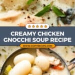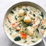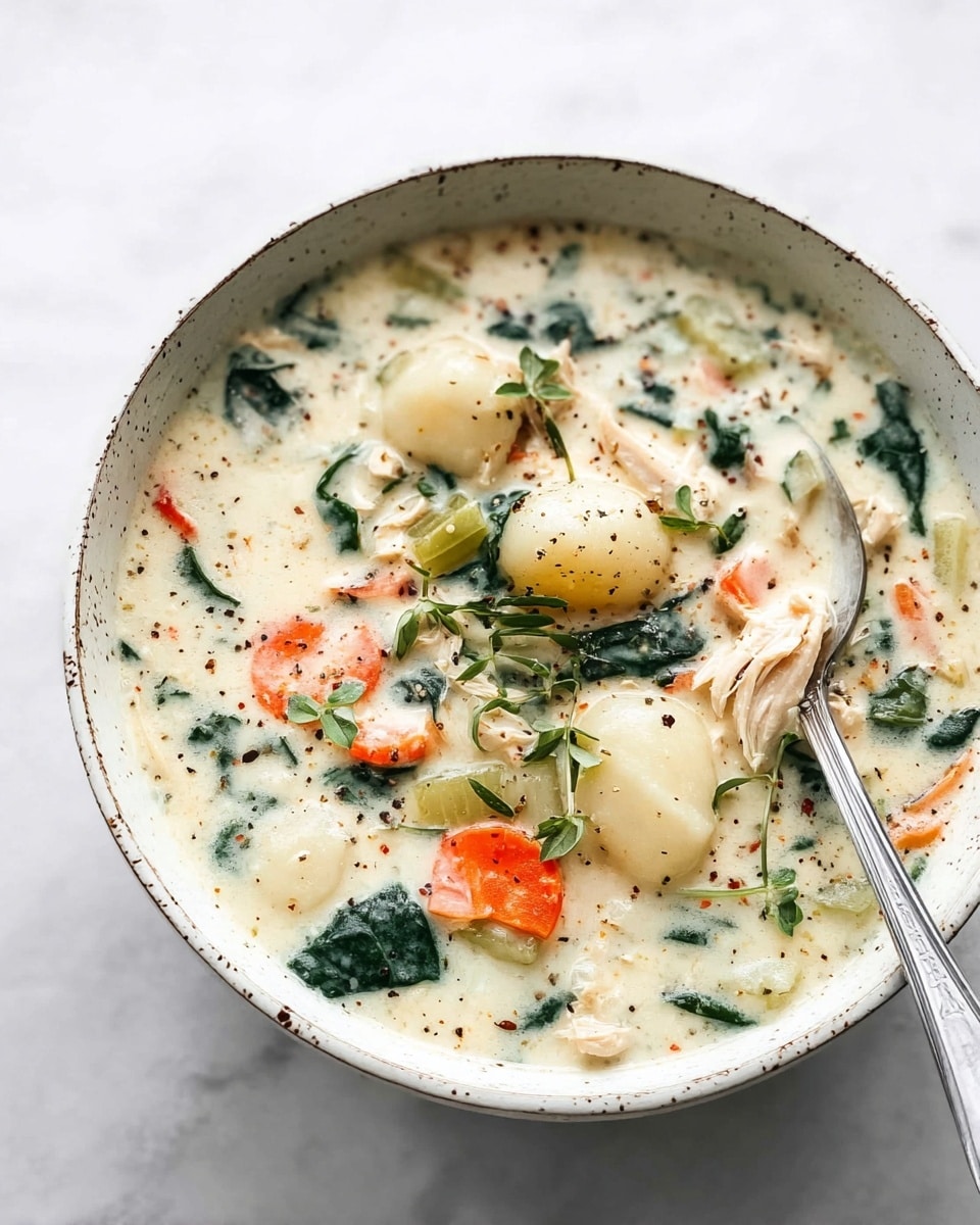 A creamy and comforting Olive Garden-style Chicken Gnocchi Soup loaded with tender chicken, fluffy potato gnocchi, fresh vegetables, and spinach in a flavorful broth enriched with half and half.