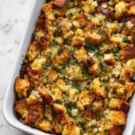 You can freeze this stuffing before cooking by wrapping the baking dish tightly with plastic wrap and foil. I’ve frozen it for up to 3 months and just baked it straight from the freezer — add a little extra baking time and cover with foil until warmed through. It’s a huge time-saver come holiday season.