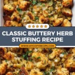 This buttery herb stuffing is a dream alongside roasted turkey or chicken, but I also love pairing it with glazed carrots, green beans almondine, or a crisp autumn salad with cranberries and walnuts. And don’t forget a smooth gravy or pan sauce — it’s perfect for spooning over the stuffing for an extra layer of comfort.