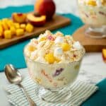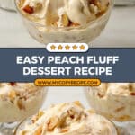 Peach Fluff is a light and airy dessert bursting with fresh peach flavor, combining peach nectar, preserves, and fresh peaches with fluffy whipped cream, mini marshmallows, and crunchy shortbread cookies. This no-bake, chilled parfait is perfect for a refreshing summer treat.