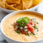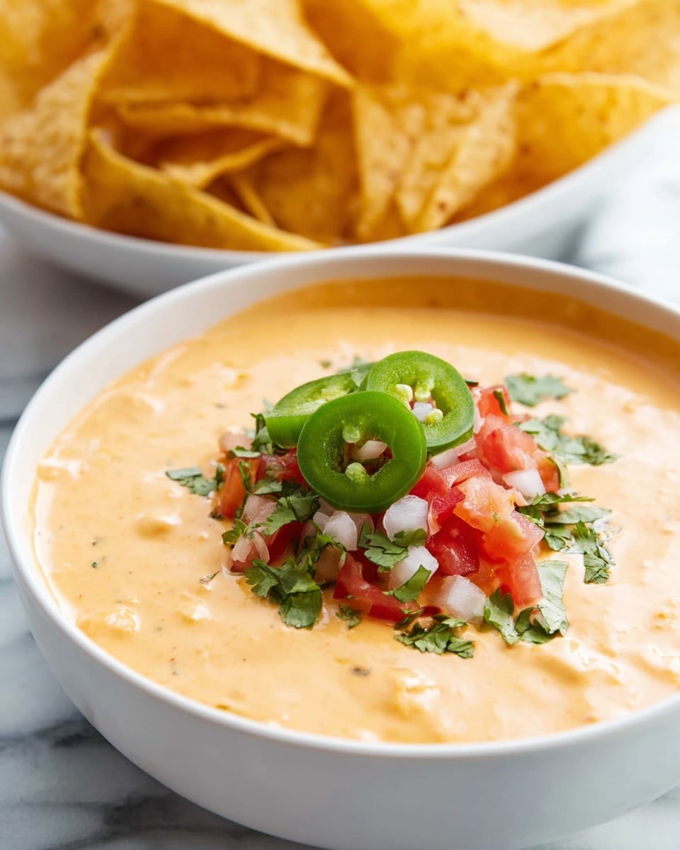 This dip is obviously perfect with tortilla chips, but I also love pairing it with crunchy veggie sticks like bell peppers or celery for a refreshing bite. For a heartier snack, queso makes a fantastic topping for baked potatoes or nachos with beans, grilled chicken, and avocado slices.