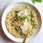 I don’t usually freeze pesto risotto because the texture after thawing can be grainy, but if you must, freeze it without the pesto and stir fresh pesto in when reheating.