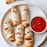 Place the pizza mummies and olive spiders on a platter, and don’t forget a bowl of extra pizza sauce on the side for dipping. Watching everyone’s faces light up when they see these spooky snacks is honestly the best part of this whole recipe for me!