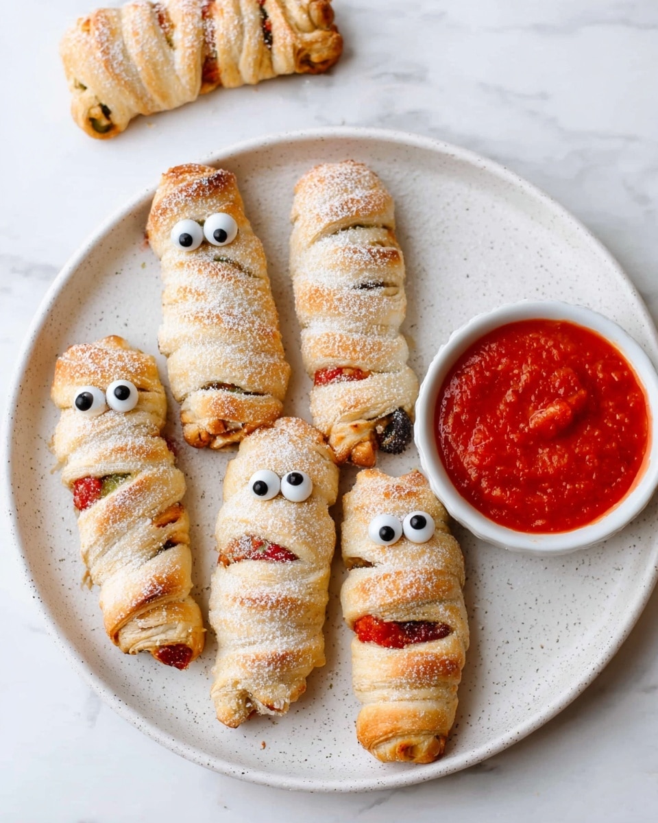 Pair these with a crisp green salad or some roasted veggies to round out the meal without overshadowing the pizza mummies. For kids, carrot sticks and ranch dip alongside the pizza sauce are a fun and colorful combo.