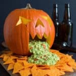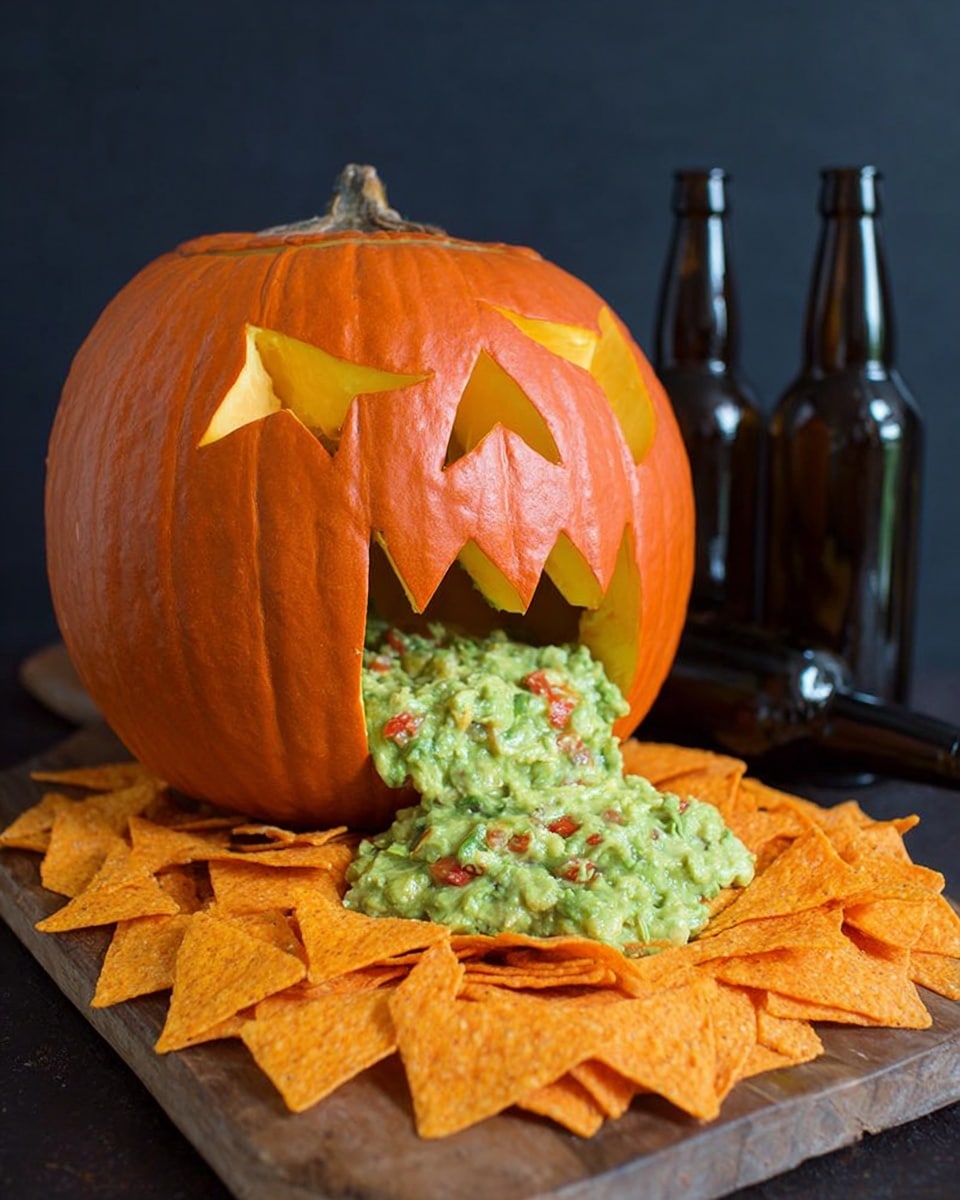 If you can’t enjoy guacamole, try substituting with a creamy pumpkin seed dip or a smooth bean dip—both can fit the Halloween theme and still “puke” out of the pumpkin in style.