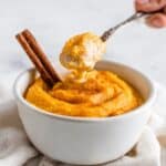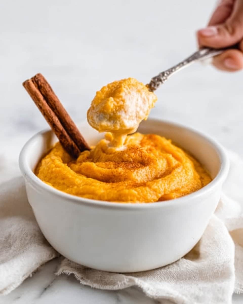 The image shows a white bowl filled with smooth, creamy orange pumpkin puree. There is a thick, brown cinnamon stick standing upright on one side of the bowl. A silver spoon with a shiny surface holds a scoop of the pumpkin puree above the bowl, with a woman's hand holding the spoon. The bowl is set on a soft white cloth on top of a white marbled surface. The colors are warm and inviting, with the orange pumpkin puree contrasting against the white bowl and background. Photo taken with an iphone --ar 4:5 --v 7