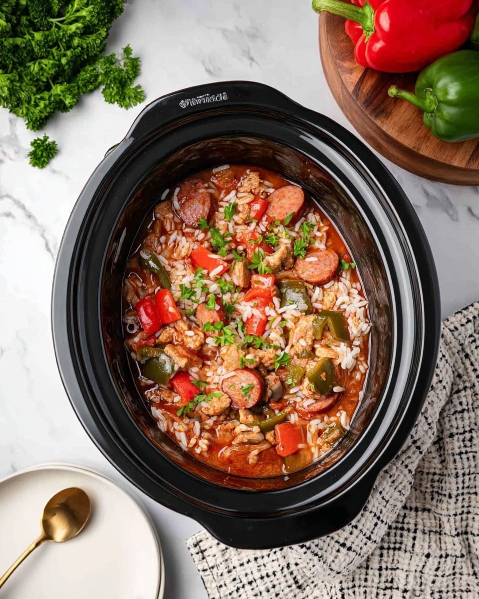 This Slow Cooker Chicken Jambalaya is a hearty and flavorful one-pot meal combining tender chicken breasts, spicy andouille sausage, vibrant bell peppers, and seasoned with Cajun spices. Perfectly cooked in a crock pot for hours, this dish offers deep, rich flavors with minimal hands-on time. Stirred together with cooked rice at the end, it makes a satisfying comfort food ideal for family dinners.