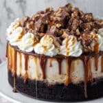 Snickers Cheesecake is a decadent, creamy vanilla cheesecake filled with chopped mini Snickers bars, layered with luscious chocolate and caramel sauces, all nestled in a rich Oreo crumb crust. This thick, gooey dessert combines the classic flavors of Snickers candy bars with a smooth cheesecake base and is topped with whipped cream and extra toppings for an indulgent treat perfect for special occasions.