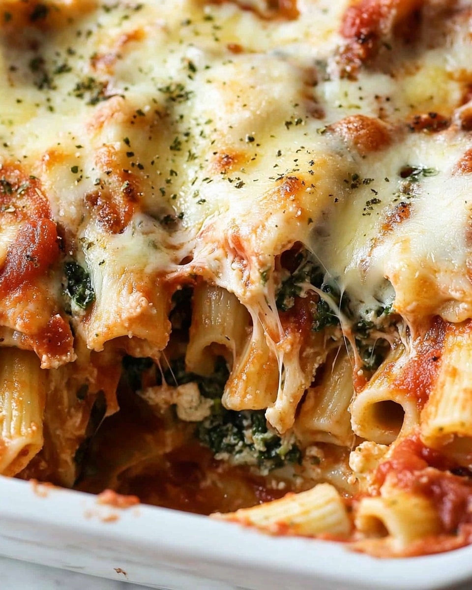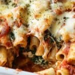 A comforting and creamy spinach and ricotta pasta bake featuring ziti pasta, a flavorful homemade tomato passata sauce, and a rich blend of ricotta, mozzarella, and parmesan cheeses baked to golden perfection.