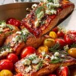 For special occasions, I like to serve the salmon right out of the skillet at the table, garnished with colorful herbs and a scattering of feta. It feels casual yet elegant—like you’re right there in the moment with your guests. Another fun idea is to plate individual salmon fillets over a bed of creamy polenta or wild rice, then spoon the roasted tomatoes on top for a rustic touch.
