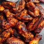 These super crispy grilled chicken wings are seasoned with a flavorful blend of spices and baked powder to ensure the skin crisps up perfectly on the grill. Smoked over your choice of wood, these wings are juicy, tender, and bursting with smoky flavor, making them a foolproof favorite for any barbecue or gathering.