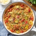 Freezing this pasta isn’t my go-to since the zucchini and summer squash can get a bit watery after thawing. But if you want to freeze it, pack it tightly in a freezer-safe container and defrost overnight in the fridge. I’d recommend reheating gently on the stove for best texture.