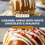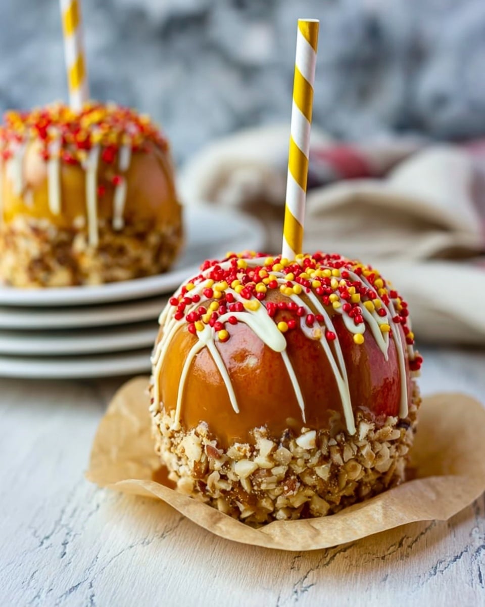 - Decorate with White Chocolate and Sprinkles: Drizzle the melted white chocolate over the walnut-coated apples and sprinkle candy decorations on top while the chocolate is still wet.