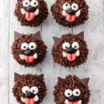These Werewolf Cupcakes are a spooky and delicious Halloween treat featuring mini triple chocolate fudge Bundt cakes topped with a rich and creamy dark chocolate frosting. Decorated with edible eyes, Sour Patch Kids for tongues, and candy accents, they bring a playful and scary vibe perfect for Halloween parties.